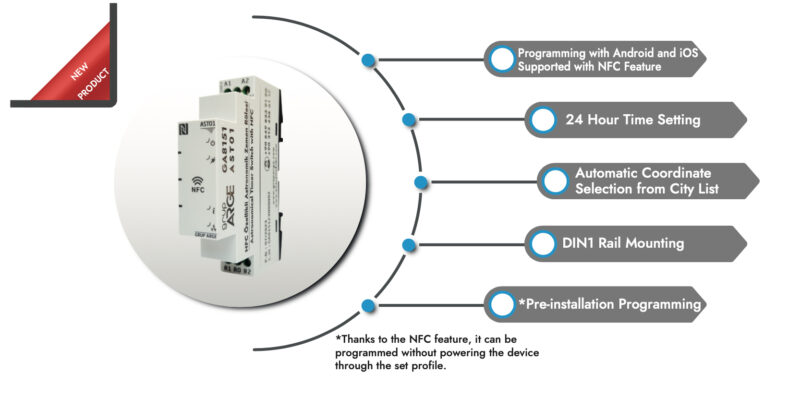 AST01 is a digital time relay with a real time clock that automatically calculates the sunrise and sunset times. AST01 is designed to control the devices connected to its contact according to the set days and hours of the week, as well as the set sunrise or sunset times.